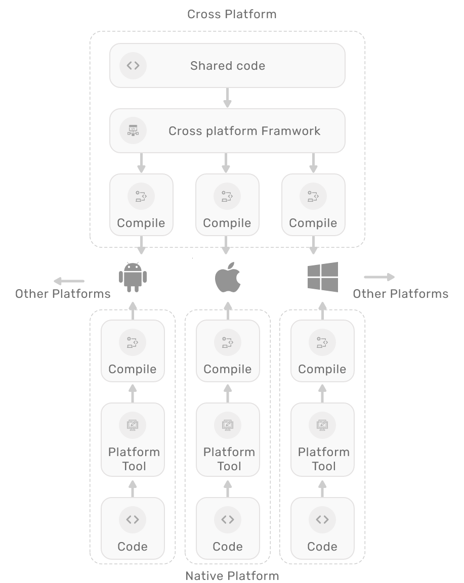 From the diagram we can see that we don’t need to write code for each platform. Instead, we write code once and the cross-platform application framework works under the hood to compile the code specifically for each supported platform.